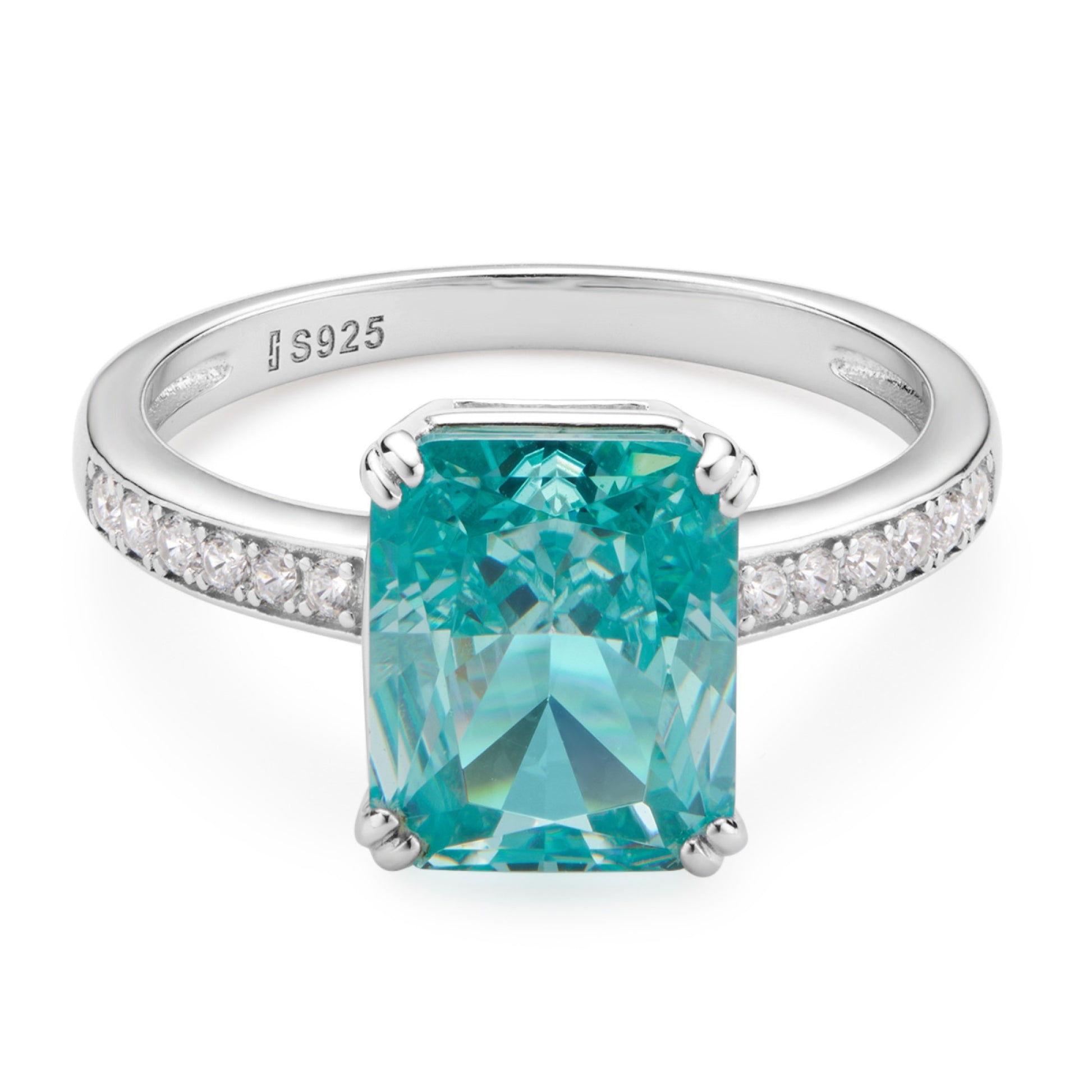 A perfect green cubic zirconia is set in rhodium plated sterling silver. Flanked by sparkly white cubic zirconia on the band. Part of the Jems Collection.